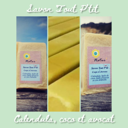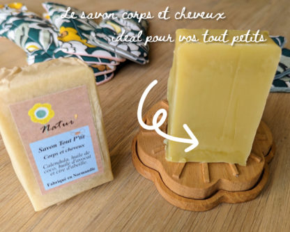 Découvrez notre savon Tout P’tit visage, corps et cheveux au macérât de Calendula Biologique.